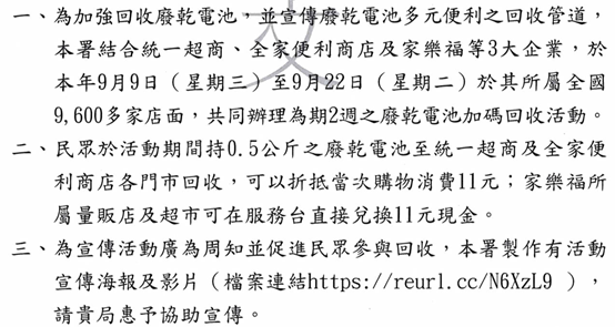 轉知行政院環境保護署自本(109)年9月9日起至9月22日止辦理全民綠生活電池加碼收活動