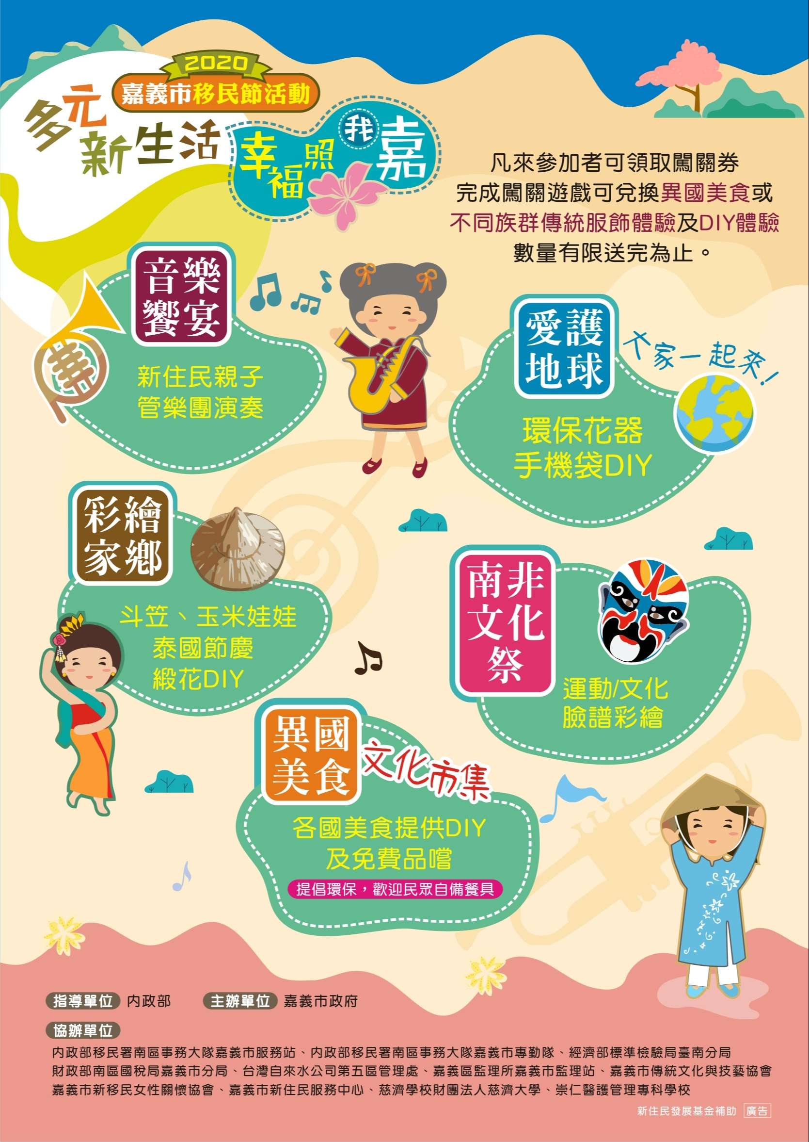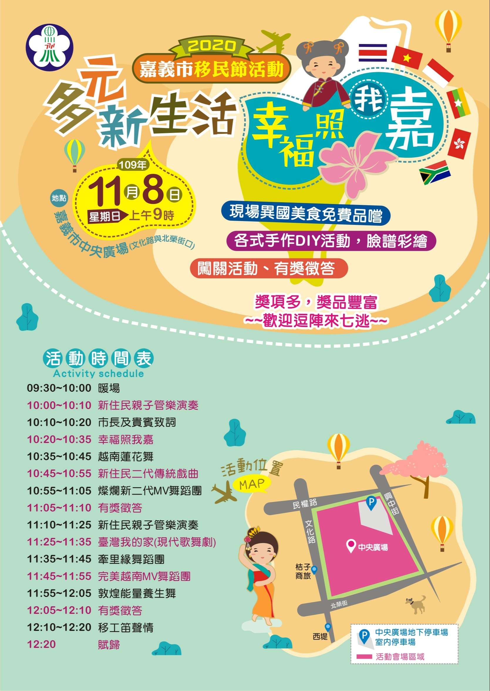 〈2020「多元新生活‧幸福照我嘉」移民節活動11月8日上午於本市中央廣場舉行,邀約一起體驗多元文化饗宴。