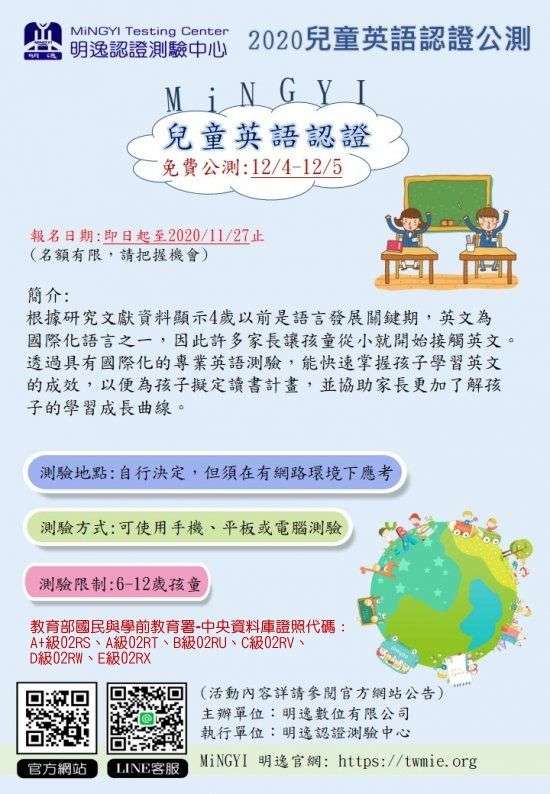 2020 MiNGYI 明逸「兒童美語認證」公測活動,有興趣之師生可免費體驗。