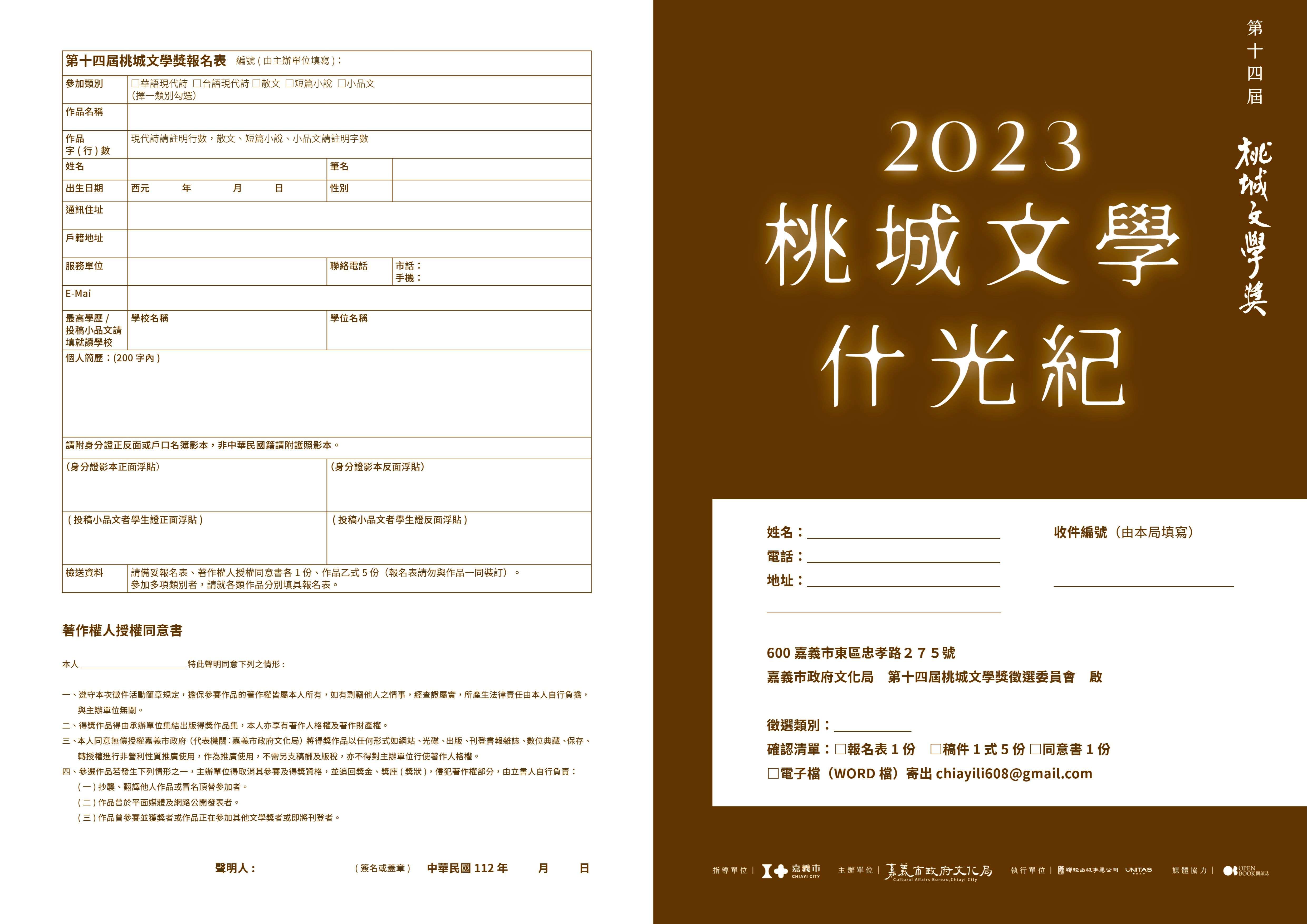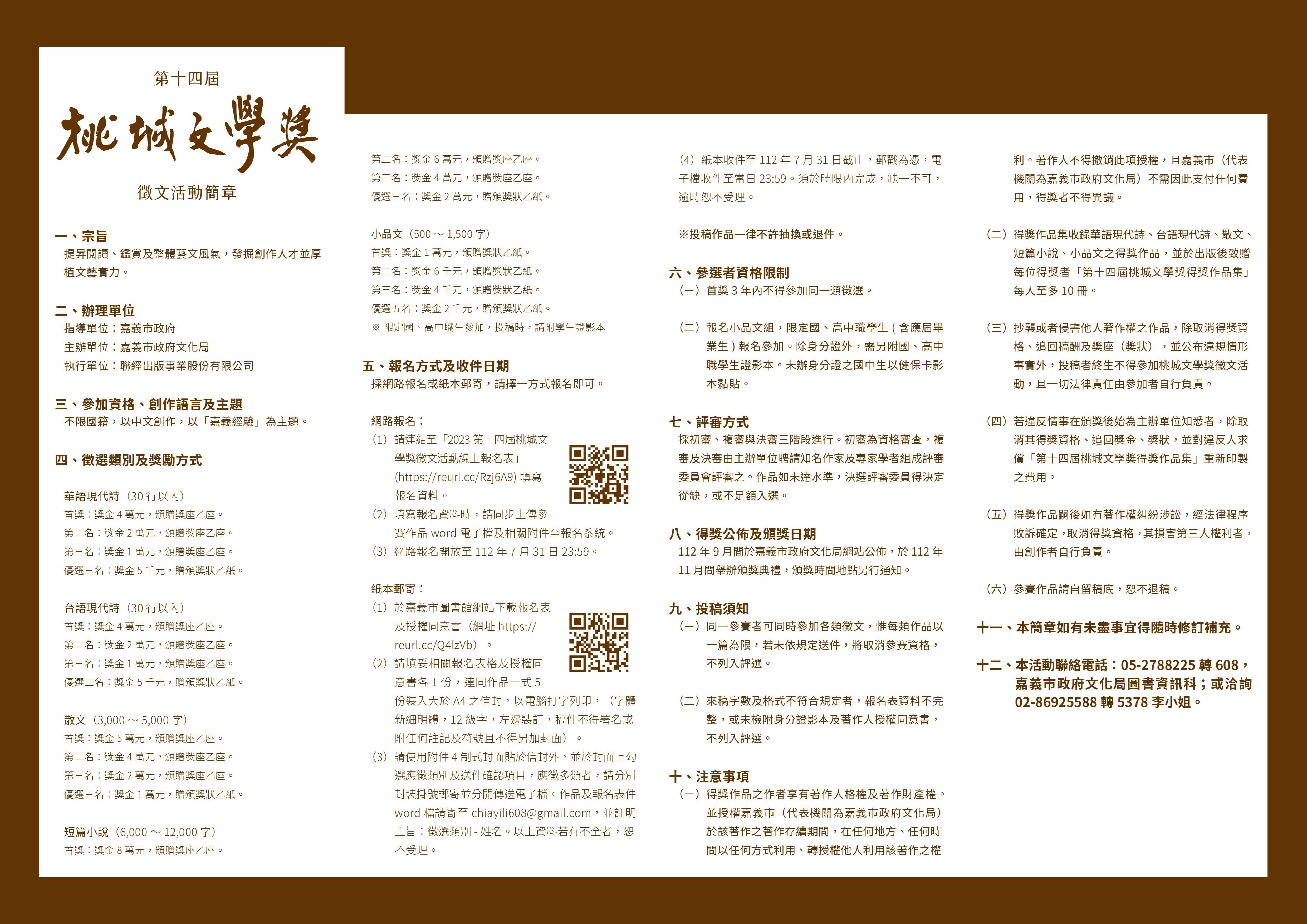 一、本屆桃城文學獎徵文時間至7月31日止,本次徵文共分五類組:華語現代詩、台語現代詩、散文、短篇小說、小品文(限定國、高中職生)。採網路報名(https://reurl.cc/Rzj6A9)或紙本郵寄,請擇一方式報名即可,詳情請見徵文簡章(網址:https://reurl.cc/Q4lzVb)。