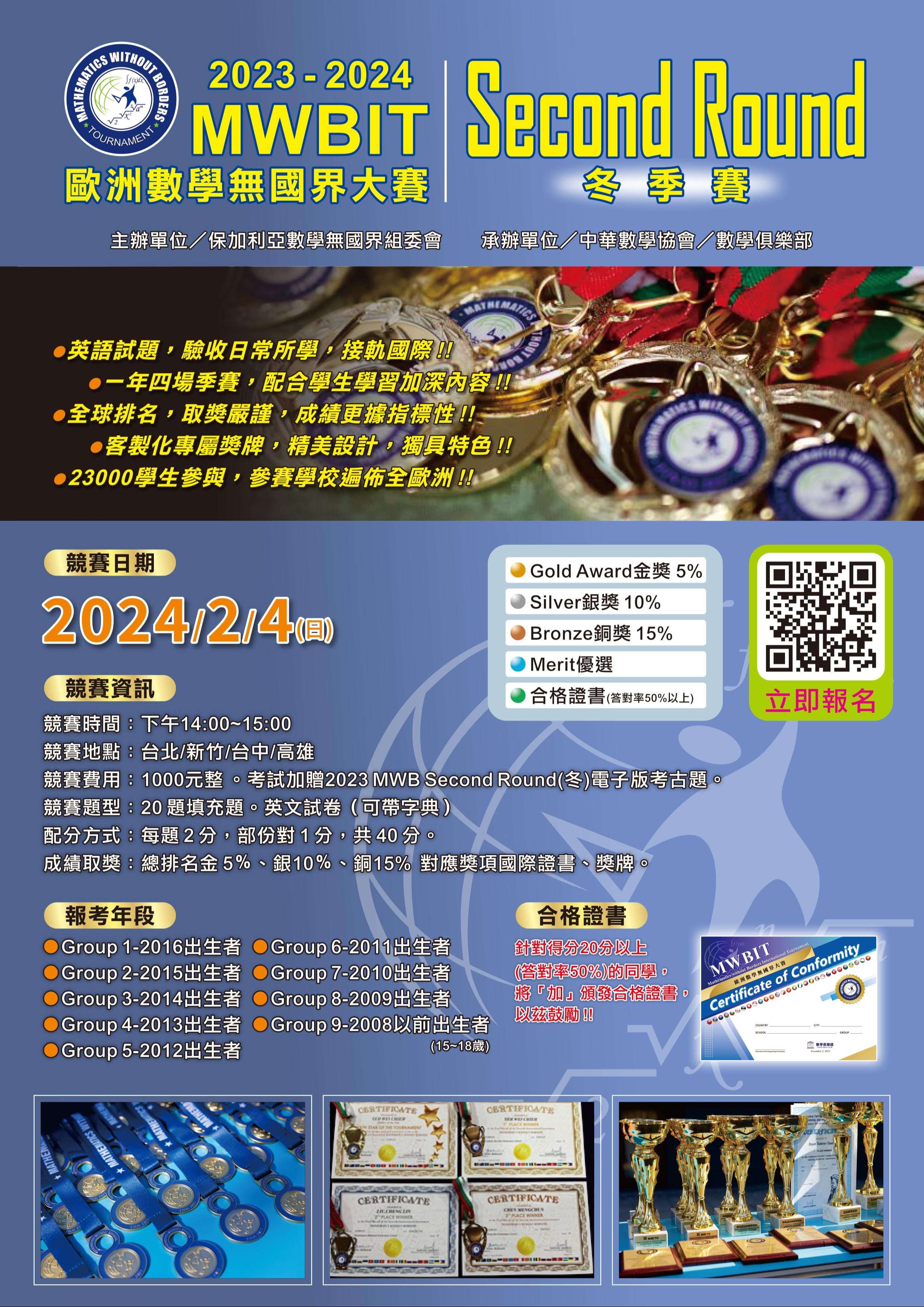 2024賽季數學無國界大賽(Mathematics Without Borders International Tournament,簡稱MWBIT)」Second Round,將於2024年02月04日 下午2點舉行,有興趣之同學可踴躍參賽。