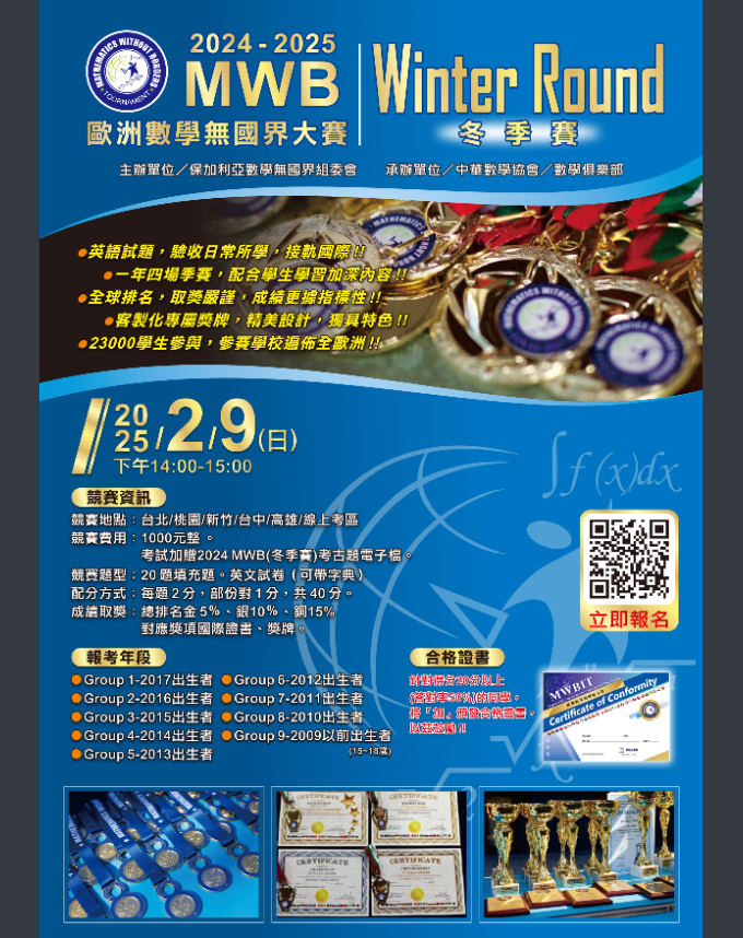 「2024-2025賽季數學無國界大賽(Mathematics Without Borders International Tournament,簡稱MWBIT)」Winter Round,將於2025年02月09日 下午2點舉行,有興趣之同學可踴躍參賽。