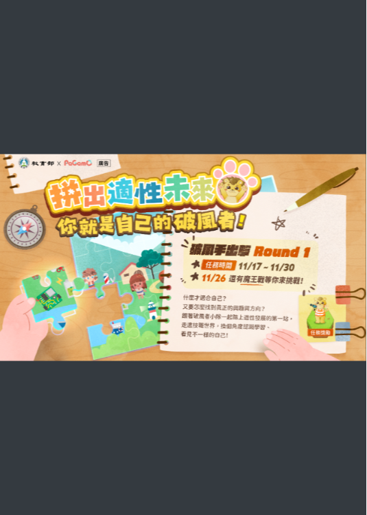 四、遊戲任務時間: (一)第一波任務:拼出適性未來_破風手出擊Round 1 1、時間:2025年11月17日至30日 2、迷惘獸魔王挑戰賽:2025年11月26日(二)第二波任務:拼出適性未來_破風手出擊Round 2 1、時間:2025年12月15日至28日 2、迷惘獸魔王挑戰賽:2025年12月24日 (三)第三波任務:拼出適性未來_破風手出擊Round 3 1、時間:2026年1月5日至18日 2、迷惘獸魔王挑戰賽:2026年1月14日