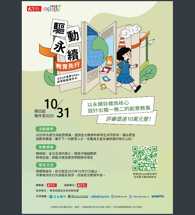 財團法人天下雜誌教育基金會與天下雜誌辦理「2025年永續台灣創意教案徵選」活動,收件期限延長至114年11月7日(星期 五),鼓勵教師踴躍參加,請查照。