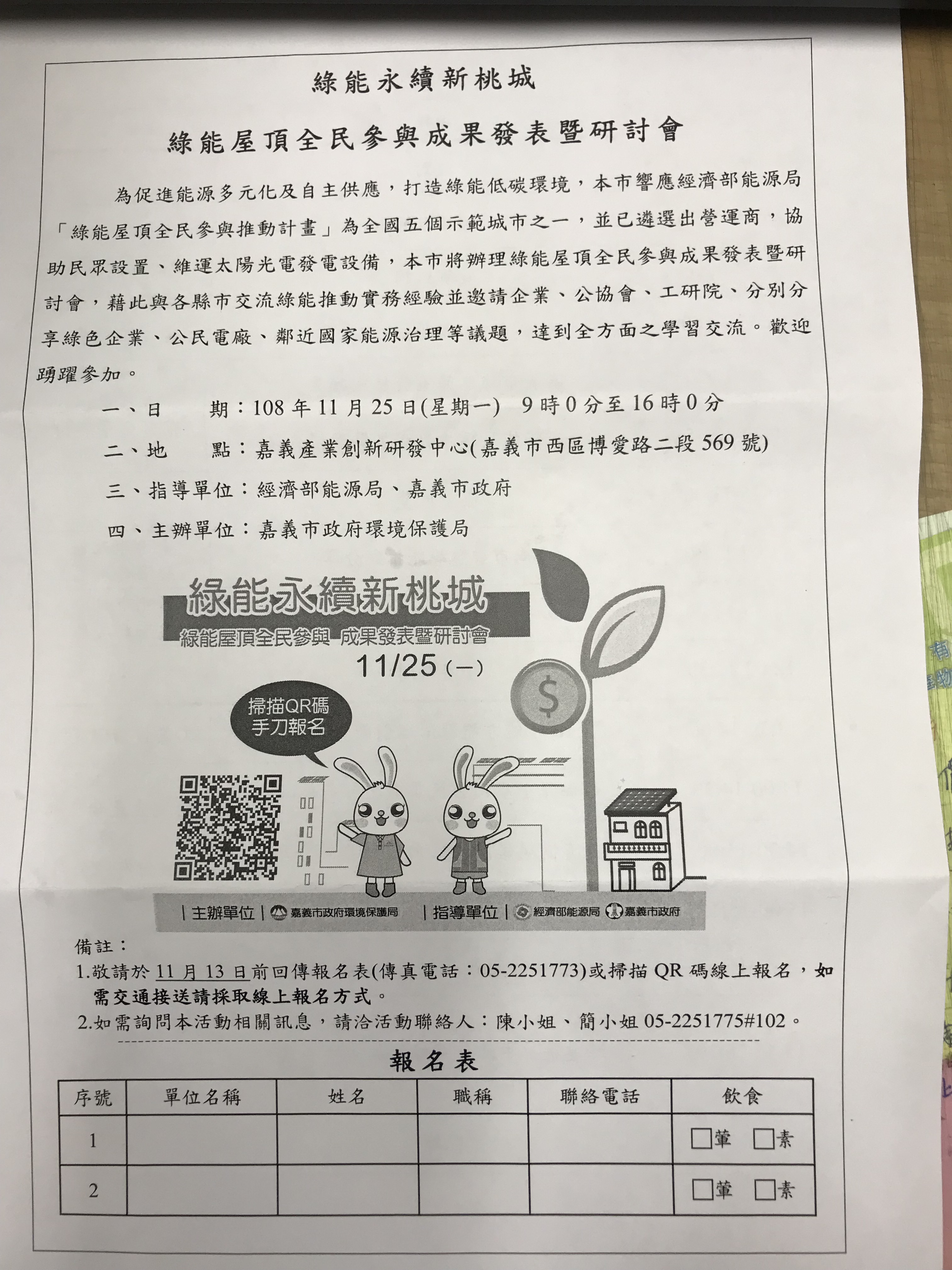 轉知 108年11月25(一)假嘉義產業創新研發中心辦理綠能永續新桃城成果發表暨研討會,報名至11/13日止,有意願報名請洽事務組。