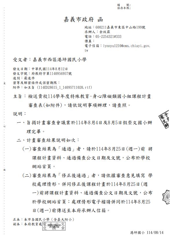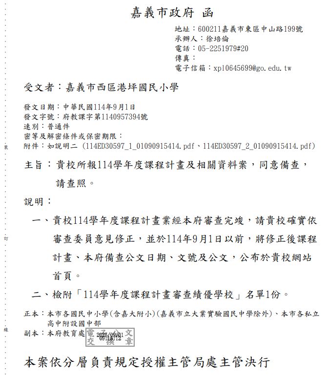 嘉義市政府114年9月1日府教課字第1140957394號通過課程計畫審查資料。嘉義市政府114年8月12日府教特字第1140956957號通過特殊教育課程計畫審查資料。