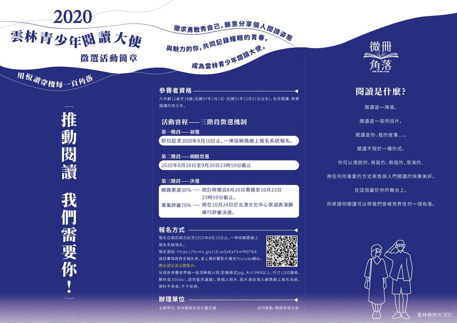 雲林縣政府辦理「2020雲林青少年閱讀大使徵選活動」,報名簡章如附件,請查照。