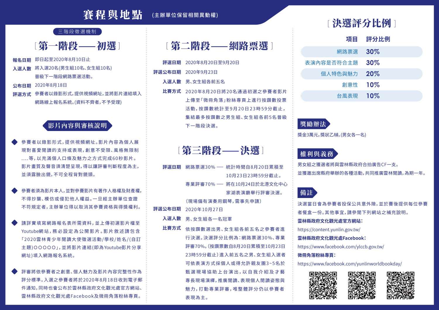(三)第三階段/決選:網路票選30%(2020年9月23日至10月23日23時59分截止)、專業評審70%,將在10月24日於北港文化中心家湖表演廳舉行評審決選。