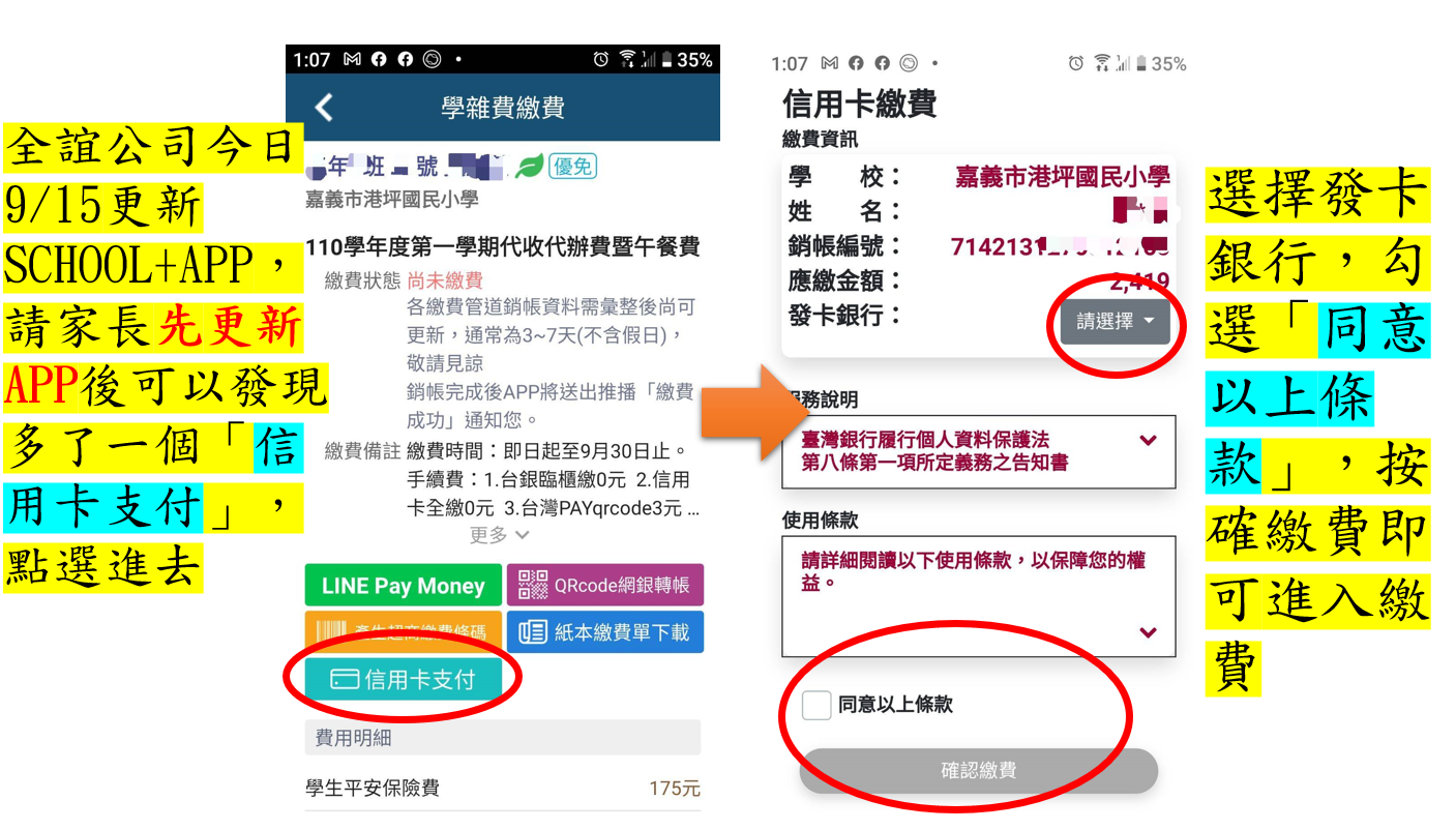 全誼公司今日9/15更新了家長版SCHOOL+,麻煩請家長更新APP,更新後可以直接在手機上連結至台銀學雜費入口網使用信用卡繳費,謝謝大家!