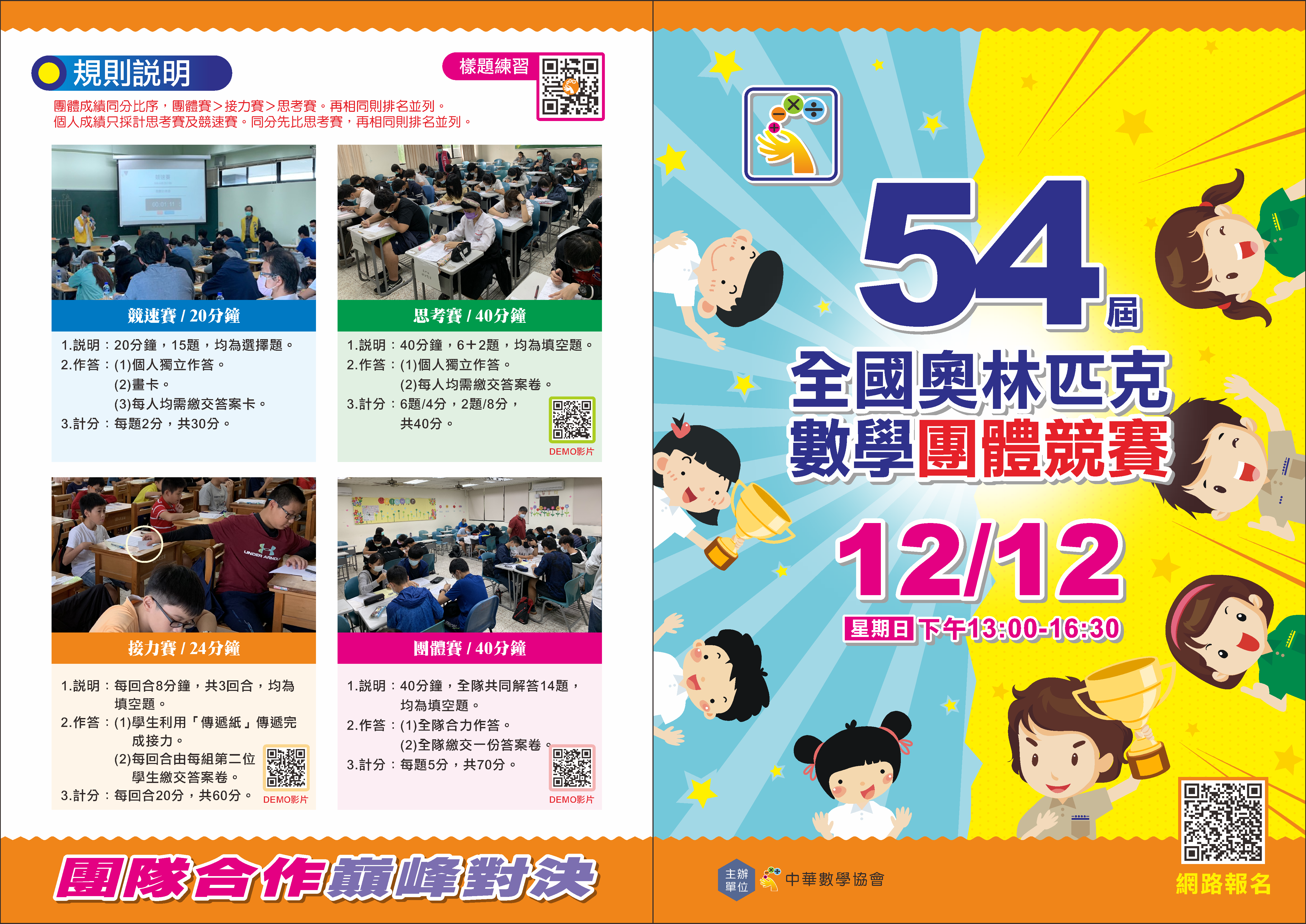 為推廣國小、國中至高中之數理教育,於110年12月12日(日)舉辦 「第54屆全國奧林匹克數學團體競賽」,有興趣之同學可參閱附件組隊參加。