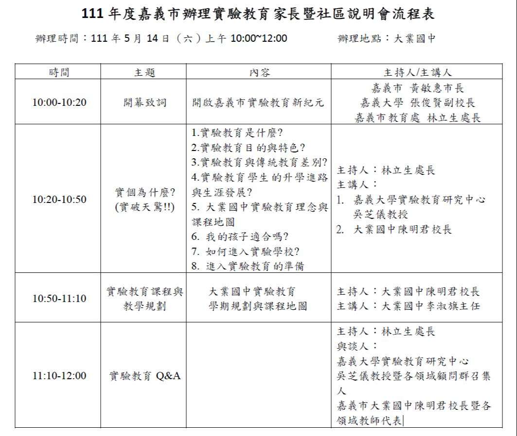 111年度嘉義市辦理實驗教育家長暨社區說明會報名表(含流程表)1份,有興趣之家長可參閱附件說明,報名參加。