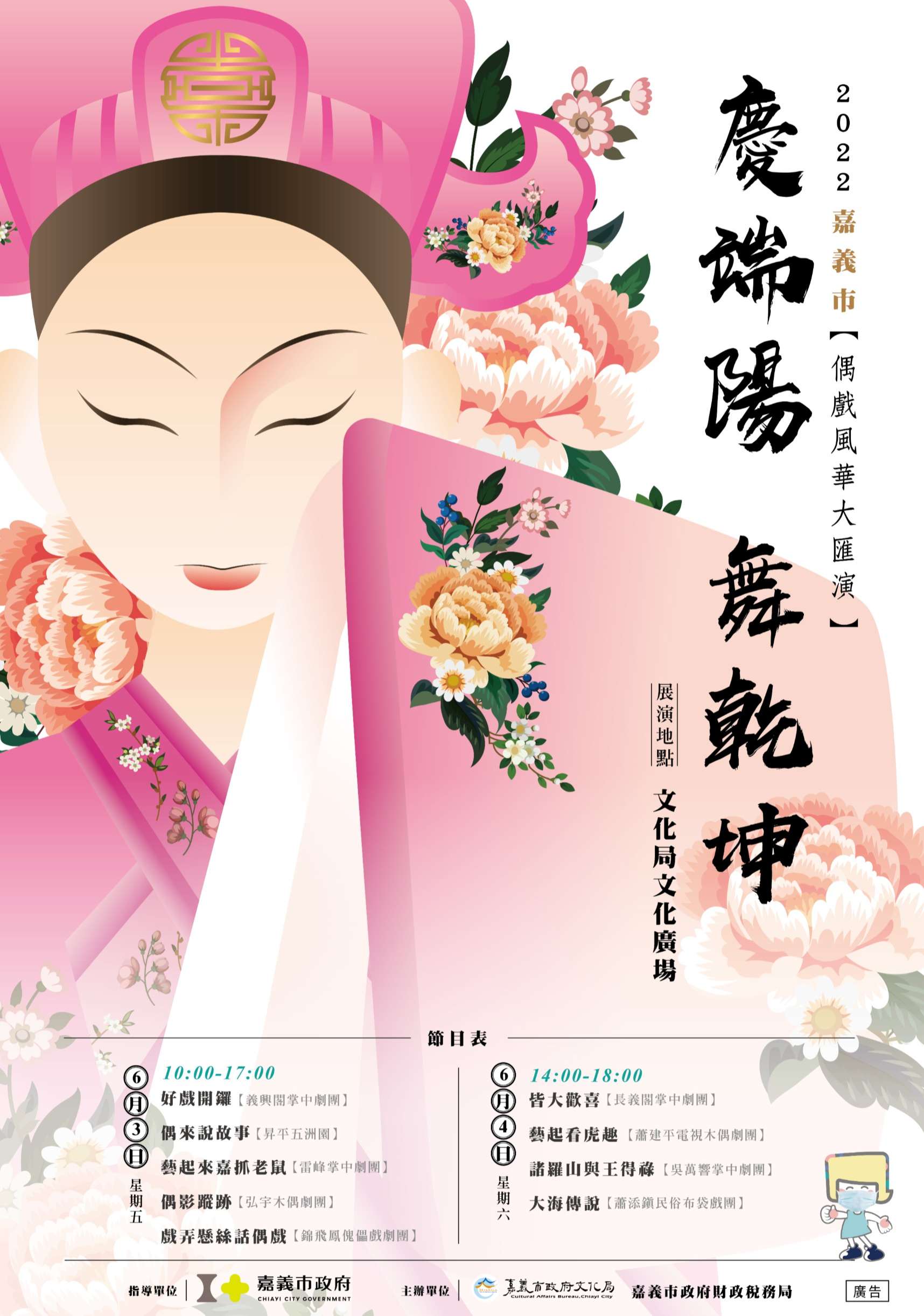 嘉義市政府文化局訂於6月3-4日假文化廣場,辦理111年「慶端陽 舞乾 坤-嘉義市偶戲風華大匯演」活動,敬請鼓勵貴校師生踴躍參加。