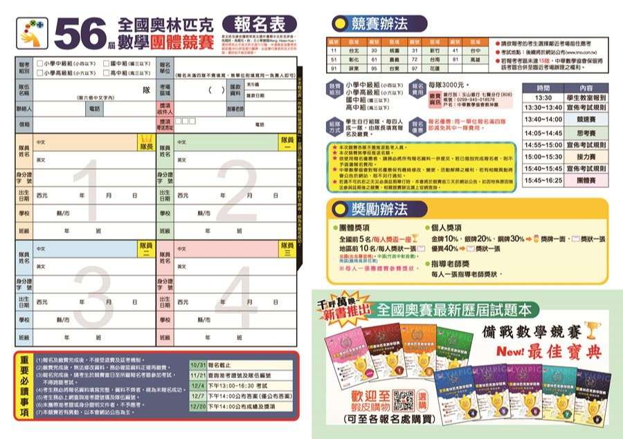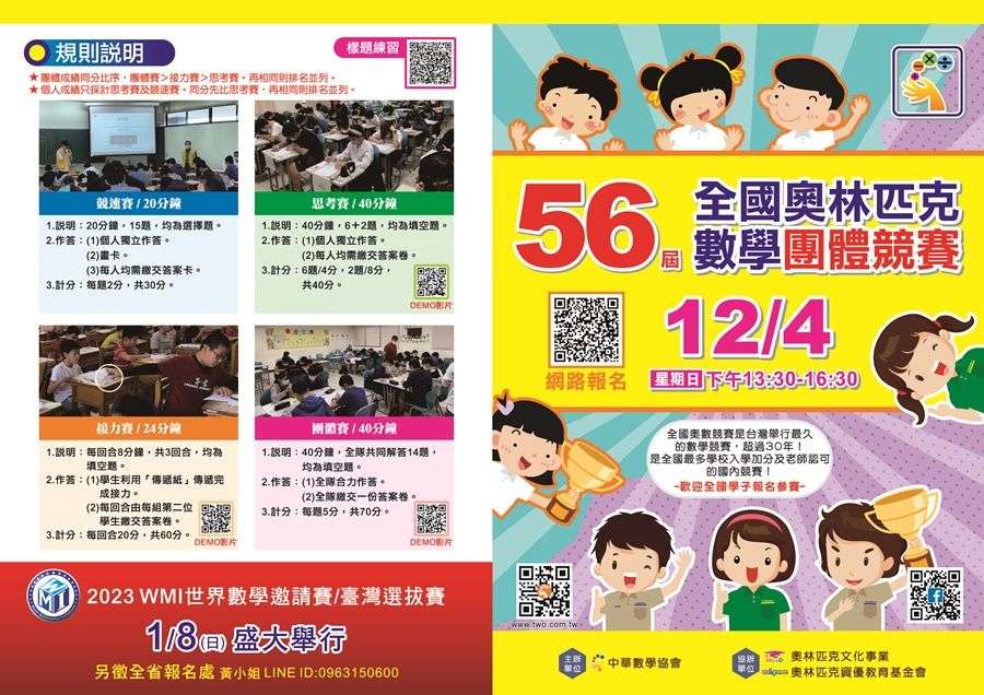 中華數學協會為推廣國小、國中至高中之數理教育,謹訂於 111 年 12 月 4 日(日) 舉辦 「第 56 屆全國奧林匹克數學團體競賽」,旨在培養學童對數理的興趣,為國家培育優秀人才。建請 貴校公告並推薦學生參加競賽,以提升數理教育,有興趣之同學可自行組隊參加。