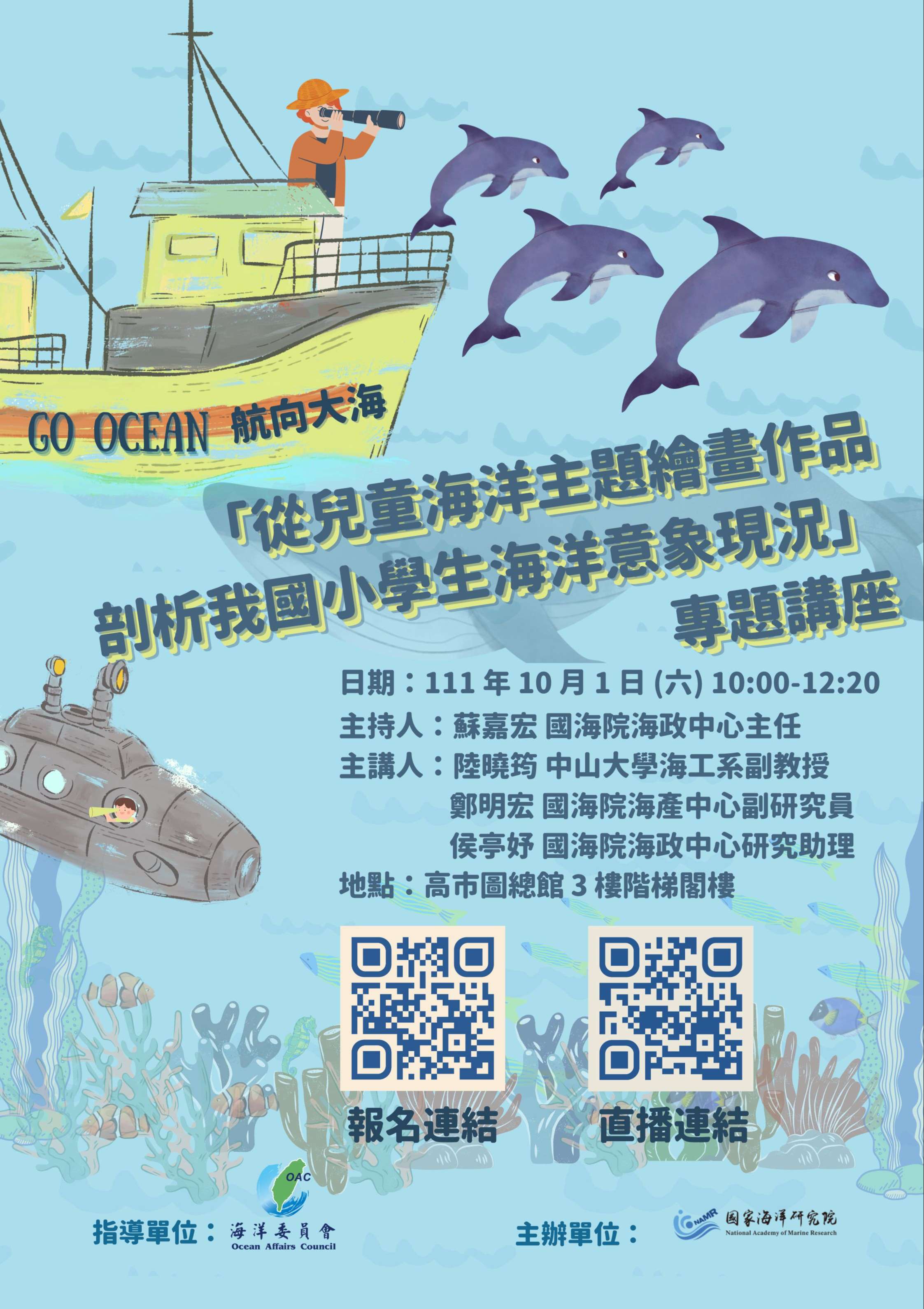 國家海洋研究院舉辦「從兒童海洋主題繪畫作品剖析我國小學生海洋意象現況」專題講座,實施計畫如附件,鼓勵所屬教師踴躍報名參加,請查照。