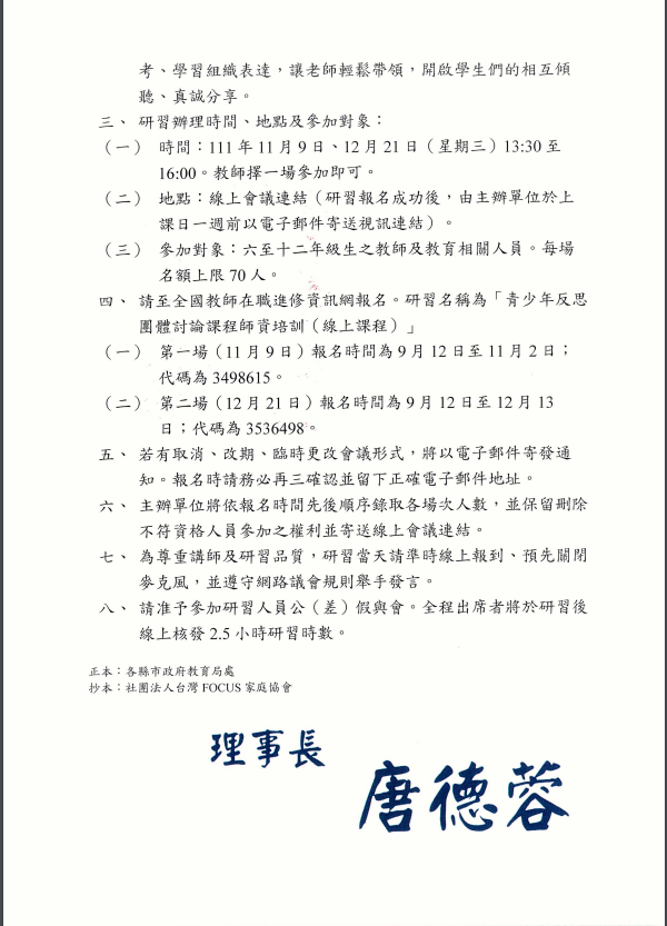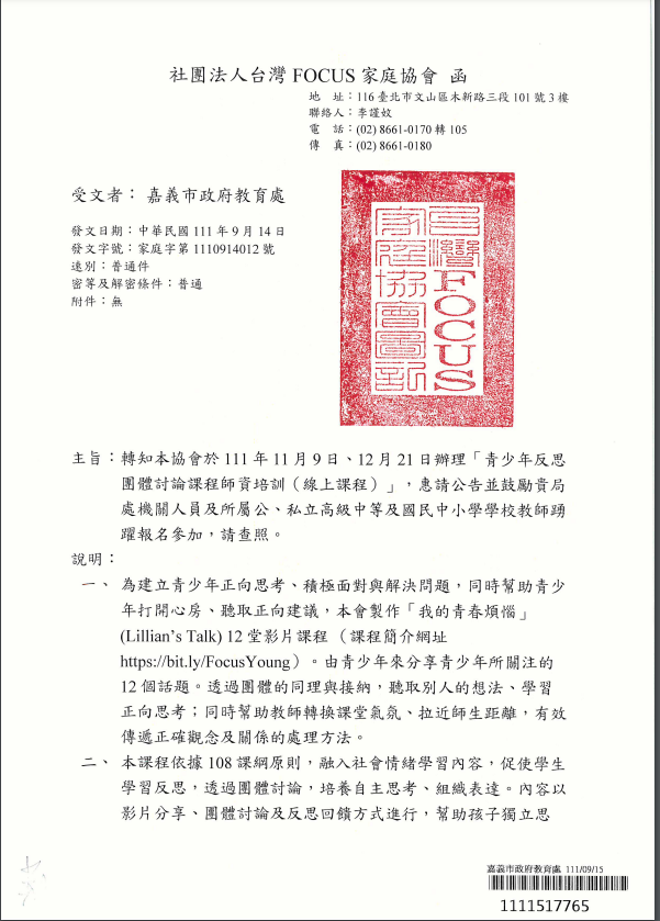 一、依據社團法人台灣FOCUS家庭協會111年9月14日家庭字第1110914012號函辦理。