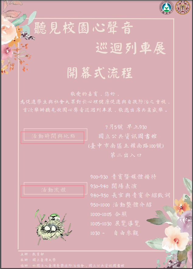 四、活動時間及地點:112年7月5日至23日,國立公共資訊圖書館(臺中市南區五權南路100號)
