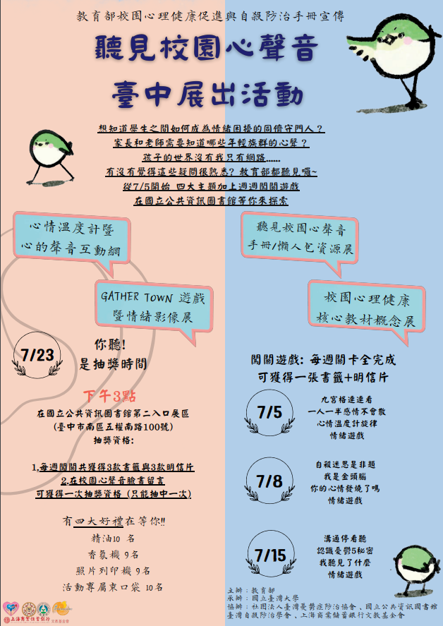 三、本活動於7月5日上午9時30分開幕,7月5日、8日及15日辦理闖關遊戲及抽獎,歡迎學生、家長及學校教職員參加。