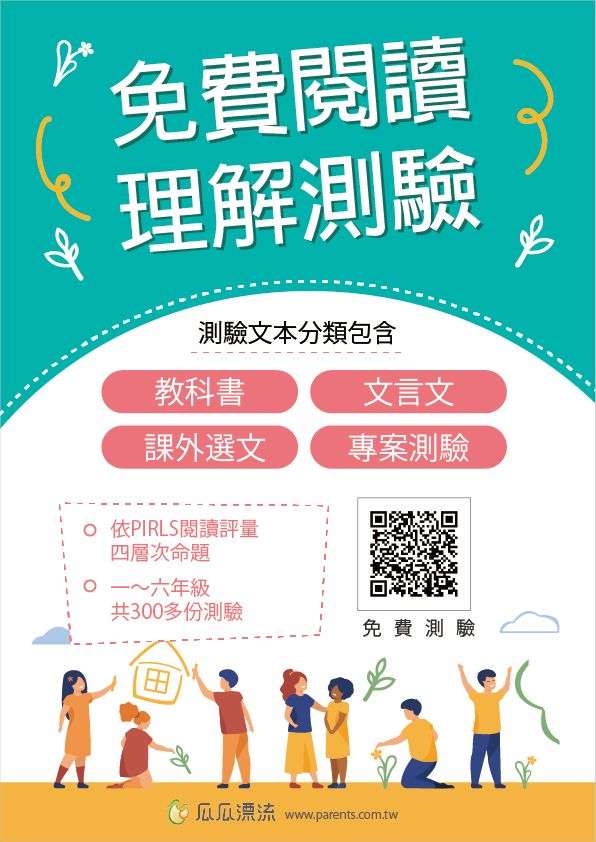 四、「教育生活家」閱讀理解測驗提供各版本國語文教科書文本測驗,完全免費使用,如附件,歡迎教師多加利用https://www.parents.com.tw/elifer/certificateComprehension。