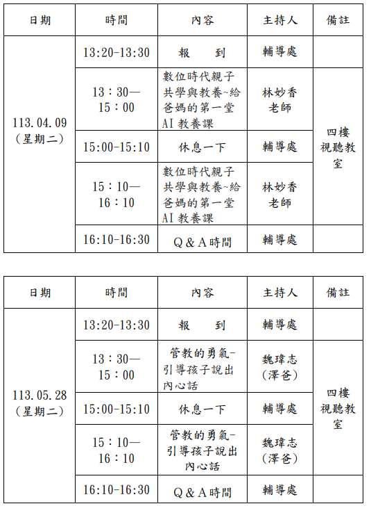 二、親職教育講座辦理時間:113年4月9日(二)及113年5月28日(二)下午1:30~16:30。