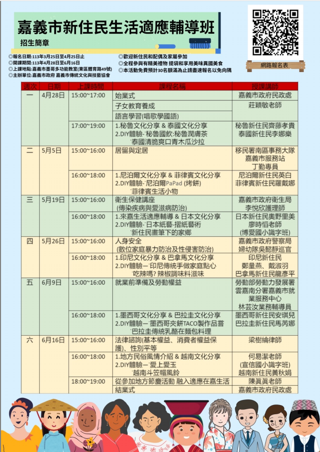 五、113年3月25日起開始受理報名,額滿截止(以報名順序為準),相關報名事宜,請電話洽詢嘉義市傳統文化與技藝協會05-2279996。