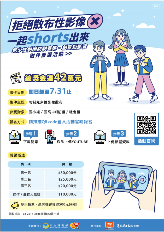 二、因應數位時代來臨,為提升兒童及青少年、家長、老師及社會大眾對於兒少網路性剝削問題的認識,以提高警覺並加強自我保護能力,爰該部規劃辦理本徵件活動,鼓勵社會大眾關注並運用多元宣導方式推廣兒少性影像防制觀念,擴大宣導效益及影響力。