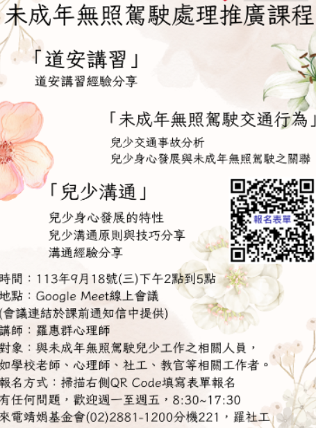 三、有鑒於此,該會期待透過辦理未成年無照駕駛處理推廣課 程,藉由邀請心理師分享於道安講習中與未成年無照駕駛 家庭上課的經驗,讓相關工作者透過本次課程交流,一同 了解如何與少年談未成年無照駕駛,同時使未成年無照駕 駛再犯的可能性降低。