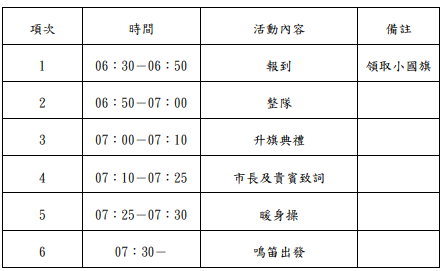元旦升旗典禮訂於114年1月1日(三)上午7時假本府前廣場舉行,並於升旗典禮結束後辦理健行活動