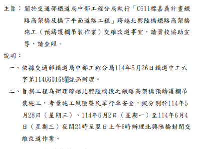 工程為辦理跨越北興陸橋段之鐵路高架橋預鑄護欄吊 裝施工,考量施工風險暨民眾行車安全,擬分別於114年5 月28日(星期三)、114年6月2日(星期一)至114年6月4 日(星期三)夜間21時至翌日上午6時辦理北興陸橋封閉交 維改道作業。